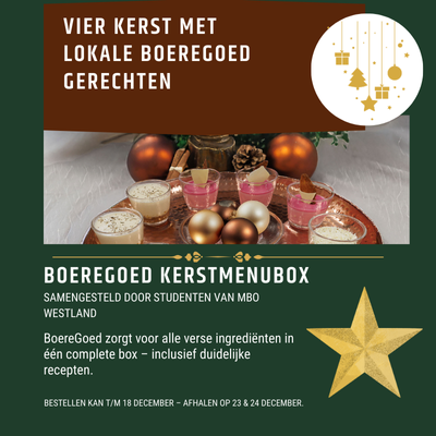 De kerstmenu buurtbox is dit jaar apart te bestellen van de groente buurtbox en kan vlak voor kerst worden afgehaald. Laat je ontzorgen en haal de smaak van de kerst in huis met BoereGoed en Lentiz!